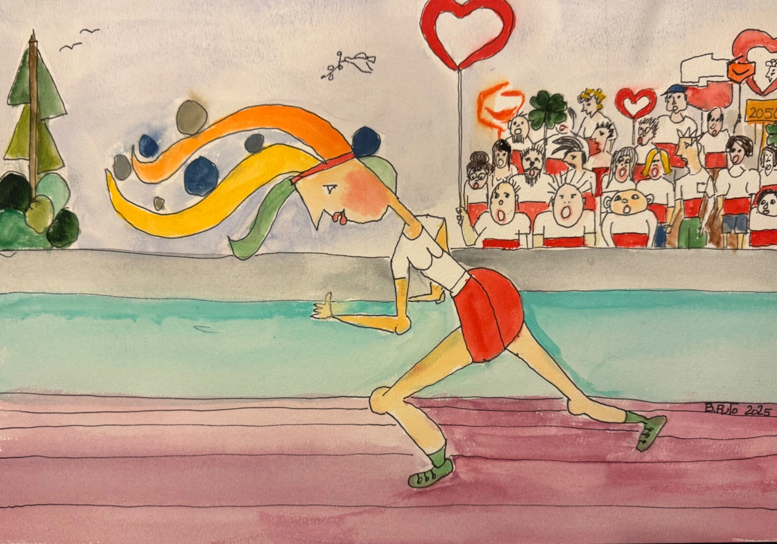 Kobieta w lokach biegnie do mety – by zwyciężyć potrzebne są głosy wsparcia - silne, obecne i słyszalne.