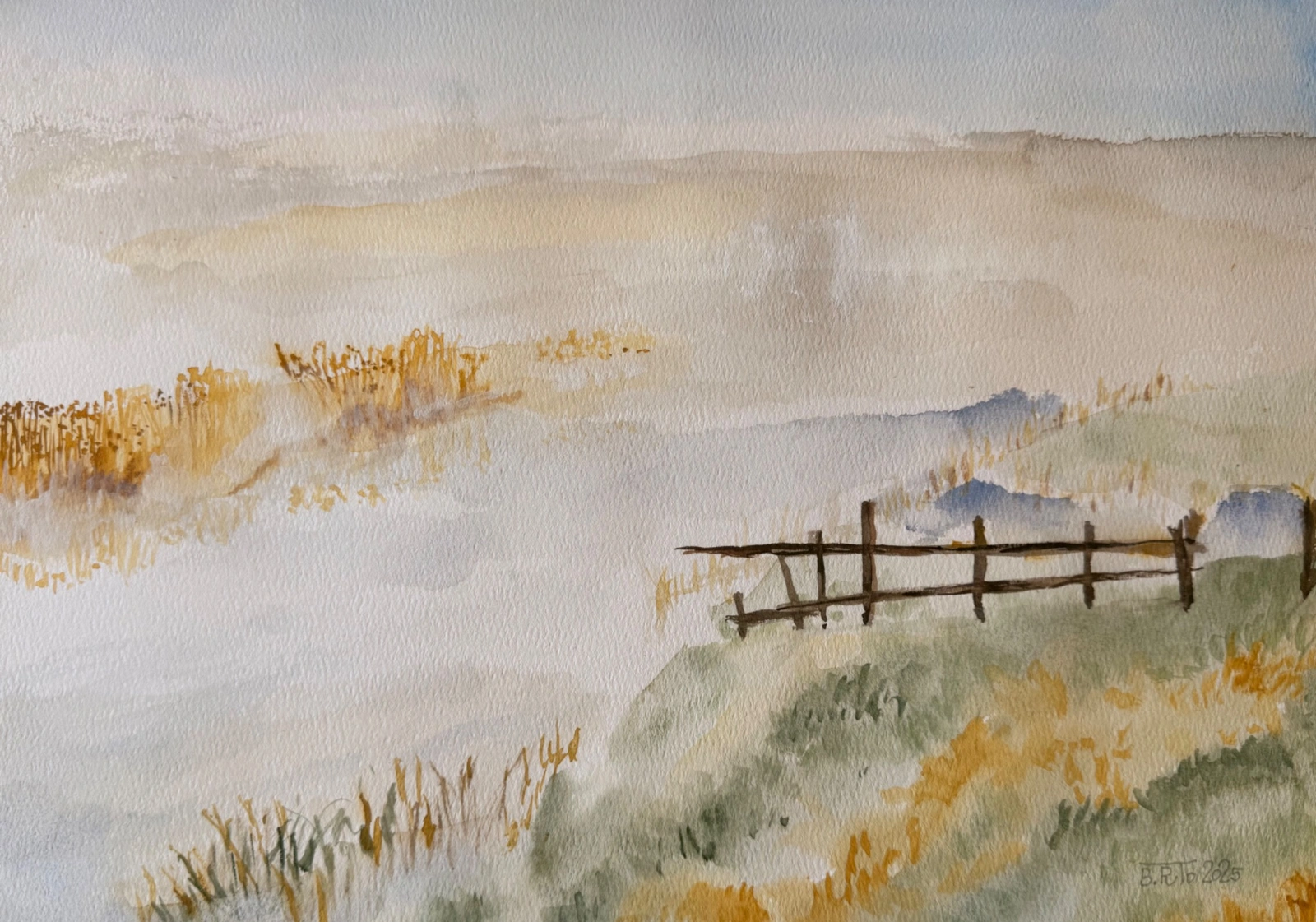 Ujmująca akwarela przedstawiająca spokojny krajobraz spowity poranną mgłą, oddająca atmosferę ciszy i świeżości świtu.