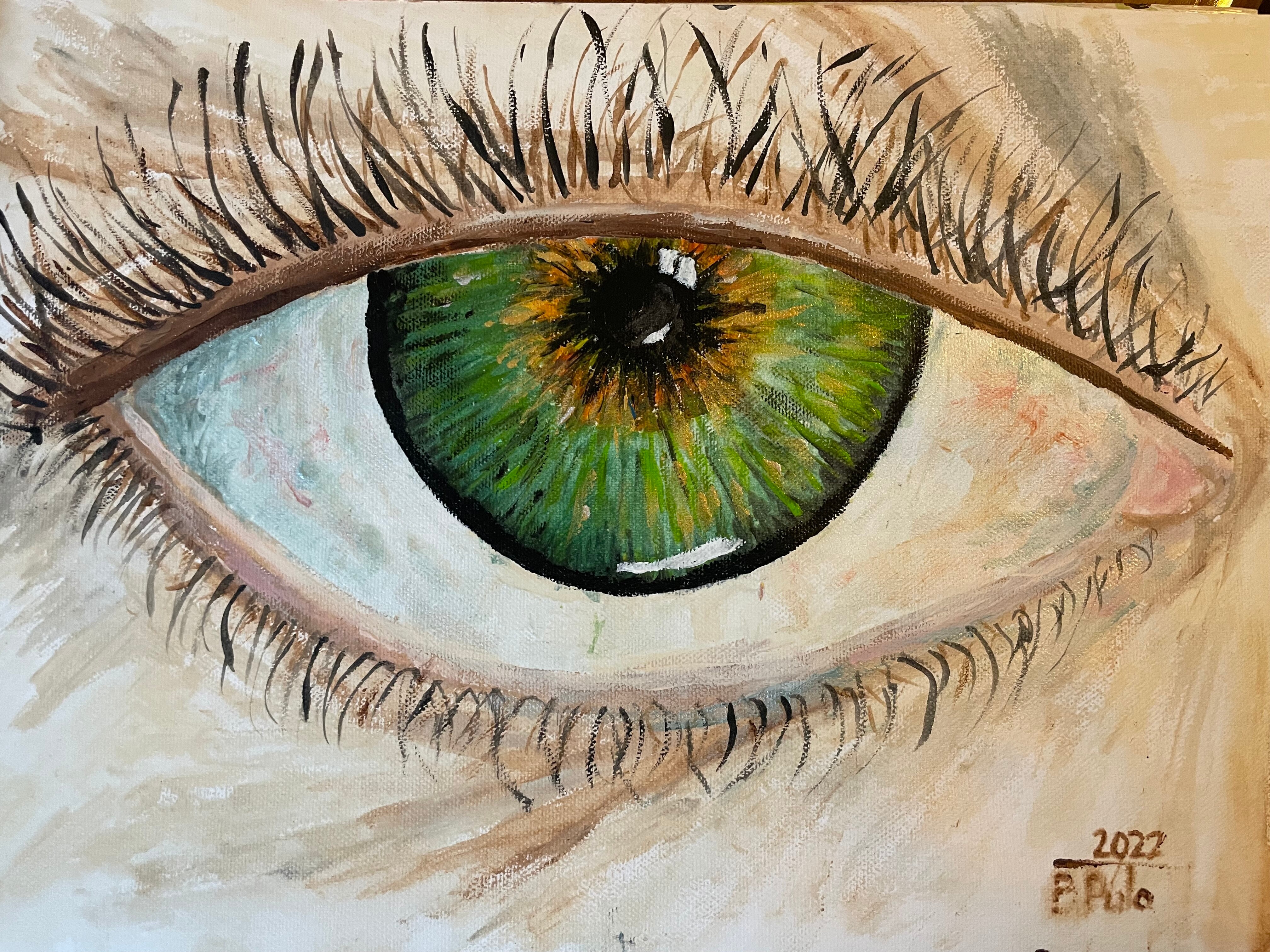 Intensywne zielone oczy, maskowa forma i ekspresyjna paleta barw tworzą obraz o silnym, nowoczesnym charakterze. Idealny do loftów, galerii i współczesnych wnętrz.