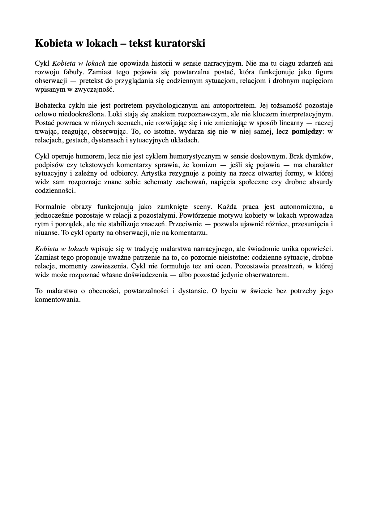 Cykl „Kobieta w lokach” składa się z obrazów przedstawiających sceny z życia codziennego, uchwycone z dystansem i ironią. Postać kobiety w lokach powraca w różnych sytuacjach, stając się nośnikiem obserwacji, a nie portretem psychologicznym. Brak dymków, tekstów czy dosłownych komunikatów sprawia, że znaczenie obrazu powstaje w relacji z widzem.