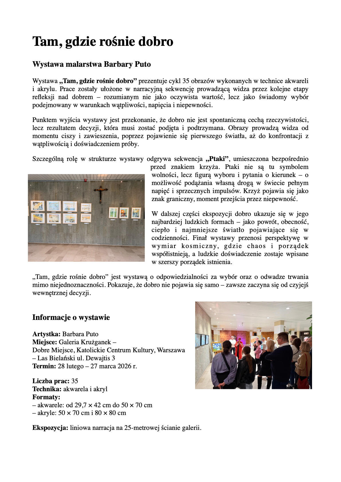„Tam, gdzie rośnie dobro” to autorska wystawa malarstwa Barbary Puto, w której dobro nie jest oczywistą wartością, lecz procesem wymagającym decyzji, trwania i przyjęcia. Wystawa prowadzi widza przez kolejne etapy: od wewnętrznego rozpoznania, przez wątpliwość i próbę, aż po doświadczenie światła jako warunku wzrostu. Obrazy zostały ułożone w spójną narrację, w której cisza, światło i odpowiedzialność tworzą jedną drogę.