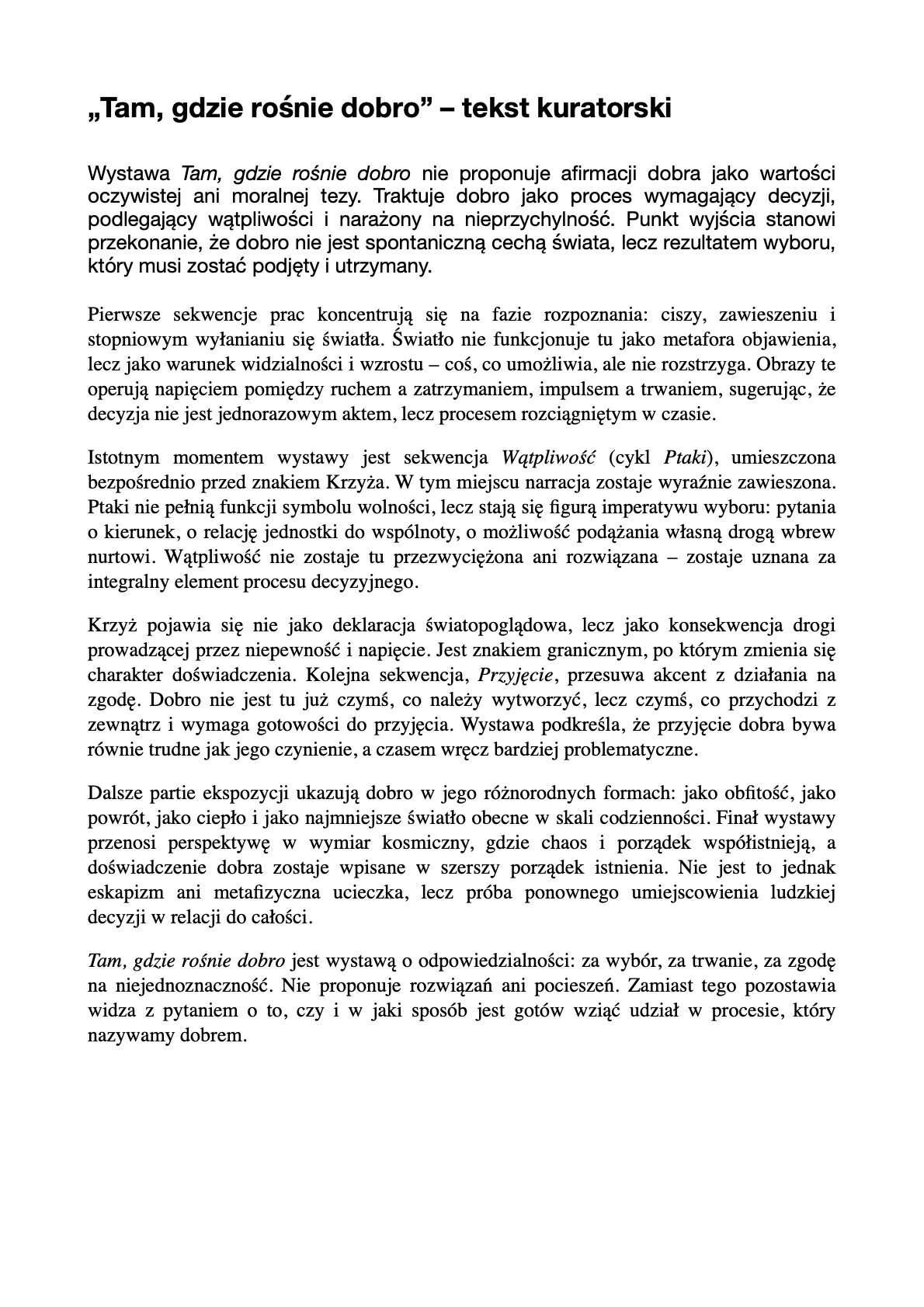 Wystawa podejmuje temat dobra jako świadomego wyboru, a nie moralnej oczywistości. Światło pojawia się tu nie jako symbol objawienia, lecz jako warunek, który umożliwia wzrost – ale go nie gwarantuje. Ważnym elementem narracji jest sekwencja „Wątpliwość”, umieszczona przed znakiem Krzyża, oraz część „Przyjęcie”, w której dobro przychodzi z zewnątrz i nie zawsze jest łatwe do zaakceptowania.